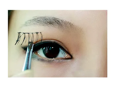 步骤七:为了完美,将一个假睫毛建成两半,分别在睫毛的后半部分粘贴。