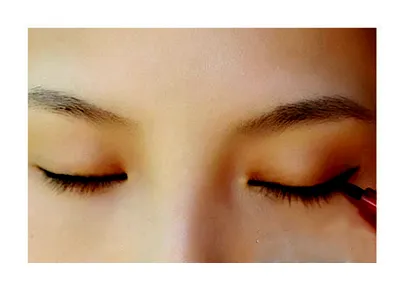步骤四:通过防水型眼线笔来化眼妆,先勾勒一条自然的眼线,然后从眼线的二分之一处往后加粗线条。