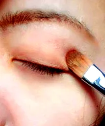 Step3:接着是眼妆部分,用金咖色的打底亮粉涂在眼窝处做打底。