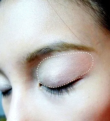 Step2:再用灰色珠光眼影,涂在虚线的部位,(如图所示),以睁开眼看的到为标准,颜色不必太浓,刷2-3次即可。