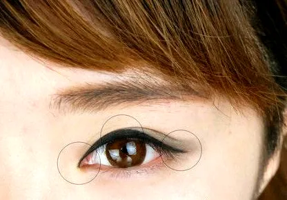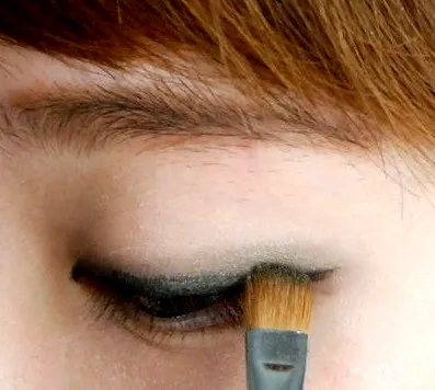 Step2:接着就是眼影部分,先用珠光白色的眼影打底,增加眼部的光泽度,然后再选择深色的眼影紧贴睫毛根部晕染,如图所示。