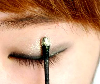 Step5:为了突出节日气氛,用棉签蘸取金色的亮粉点在眼中位置,这样很有Bling Bling风。