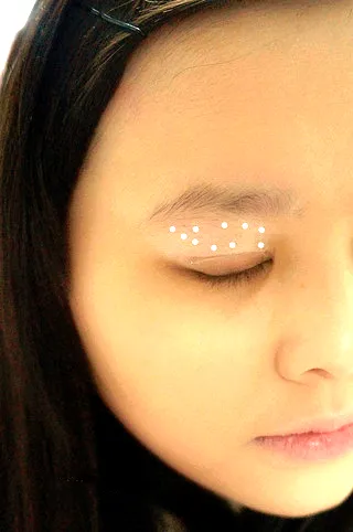 步骤二:在双眼皮褶皱处贴**眼皮贴,然后在双眼皮上面涂上米白色眼影提亮。
