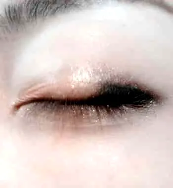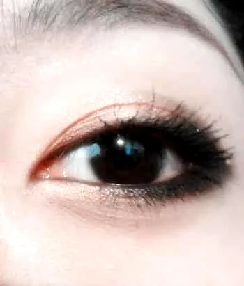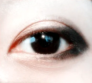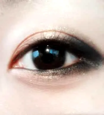 眼妆Step6:换一把干净的眼影刷,蘸取杏色眼影在黑色眼影外的区域加强提亮。