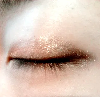 眼妆Step3:紧接着用眼影刷蘸取金棕色眼影,在双眼皮和睫毛根部之间的区域涂抹好,下眼睑也需要轻涂一层。