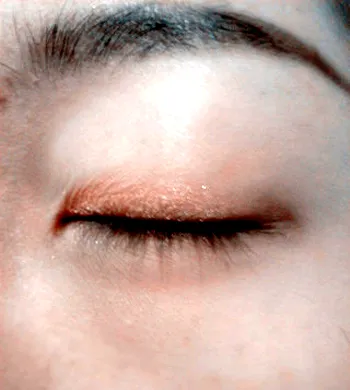 眼妆Step2:指腹蘸取橙色眼影,在整个眼窝处轻轻的推开,只需要一点点就能让眼皮看起来很通透。