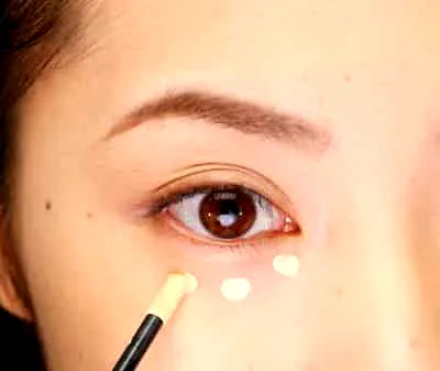 Step2:为了让黑眼圈消失,针对咖色黑眼圈就需要借助橙色遮瑕膏,点涂后轻轻怕打才会自然。
