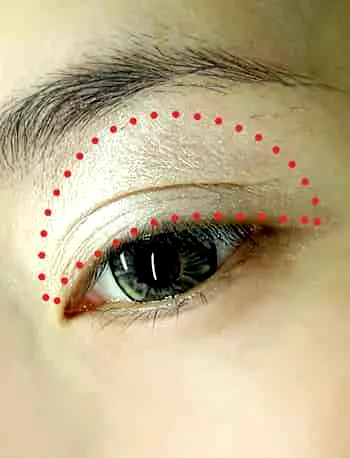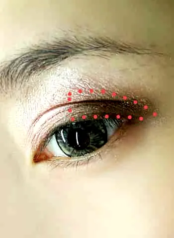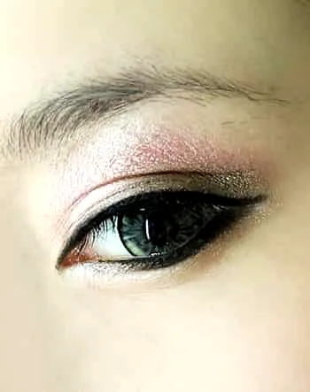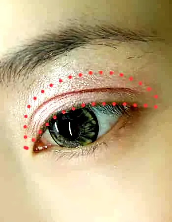 Step4:用眼影刷蘸取少量的粉色眼影,沿着双眼皮褶皱轻轻涂上,如图。