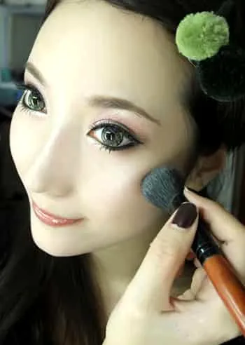 Step9:找到散状的粉刷,蘸取少量的芭比粉腮红,沿着颧骨最高处轻轻晕染开。