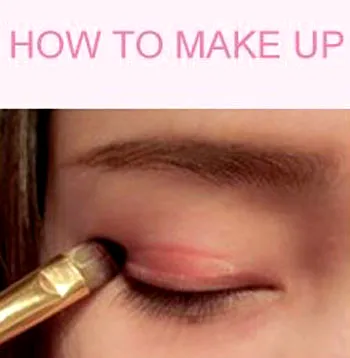 Step3:使用干净的眼影刷,蘸取淡粉色眼影,沿着双眼皮褶皱处涂描,在眼尾处适当延伸和填满。