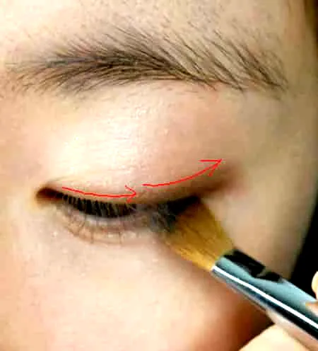 步骤四:眼妆部分首先就是用带有珠光的浅色眼影用眼影刷刷在眼窝、眼尾和下眼尾三分之一的位置上。