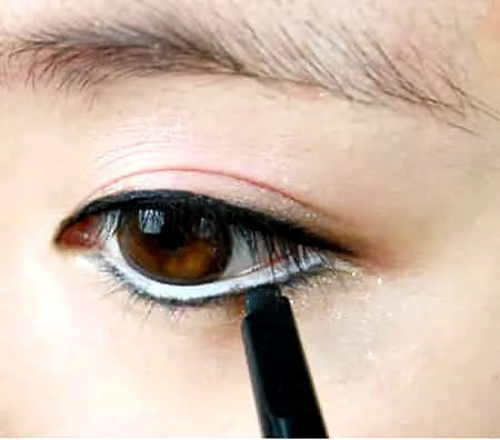 步骤七:然后就是画上眼线和下眼线,中间用白色的眼线来修饰,让眼睛瞬间变大,变的楚楚动人。