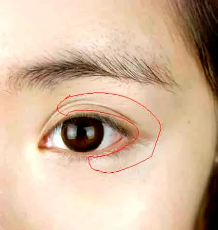 步骤五:接着用棕色的眼影晕染在双眼皮、睫毛根部以及下眼尾三分之一的肌肤上。