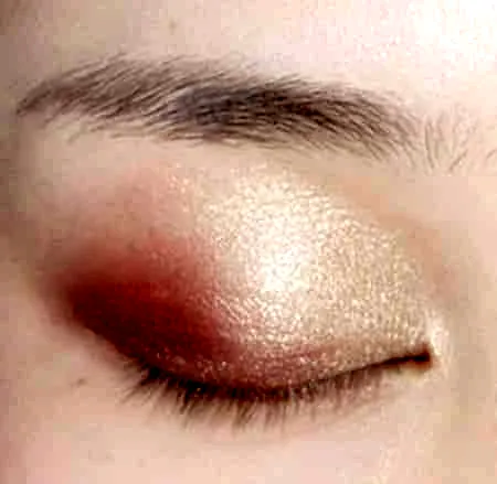 步骤四:用金色的眼影打在上眼睑的肌肤上,位于眼头三分之二的位置上,接着用金棕色的眼影打在上眼睑眼尾的位置上,让层次感凸显。
