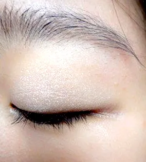 Step2:指腹蘸取少量的白色眼影,在整个眼窝部分涂满,如图。