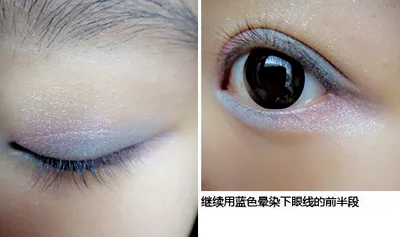 Step5:找到干净的眼影在上眼皮的睫毛根部涂上浅蓝色眼影,利用粉刷上剩余的眼影在眼头涂上,营造清新的感觉。