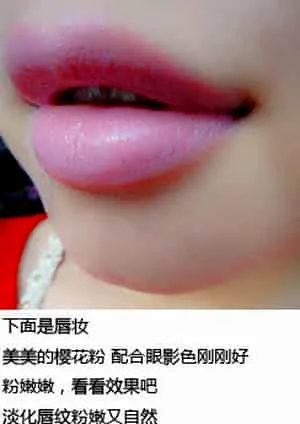 Step7:最后只需要选择樱花粉的唇膏,沿着双唇反复涂两次,唇色立马变得均匀饱满。