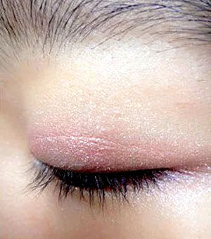 Step3:然后在双眼皮褶皱的地方轻轻涂上浅粉色眼影,如图。