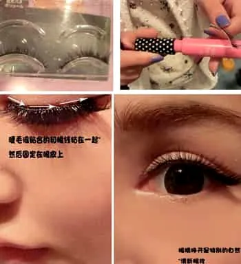 Step7:既然是日系妆容少不了假睫毛的陪衬,在睫毛根部涂上胶水,然后沿着睫毛根部粘贴在眼线上,让眼线和假睫毛融为一体。