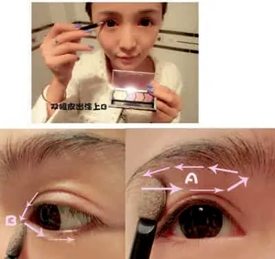 Step3:在眼窝上涂满杏色眼影打底,然后沿着双眼皮褶皱处用粉色加强,利用眼影刷上剩余的眼影在眼头的三角区域轻涂。