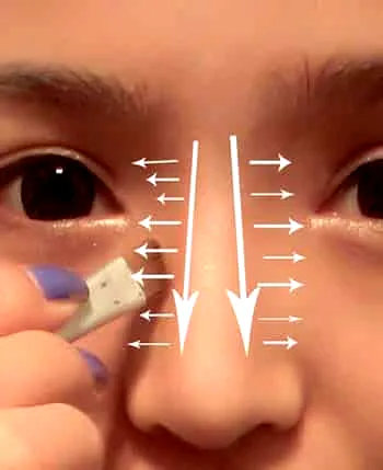 Step5:为了加强脸部的立体感,需要加强鼻影部分,使用浅咖色眉粉涂刷眉毛,然后沿着眉头向鼻翼两侧延伸,如图。