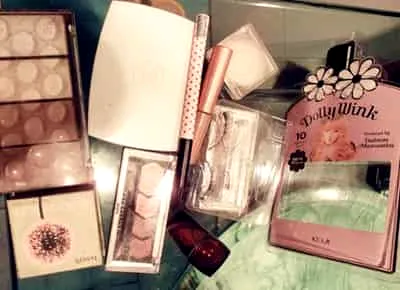 Step1:首先需要准备一些日系妆容必备的彩妆工具,如贝玲妃的珊瑚腮红、Dolly wink假睫毛、**儿粉饼、KOJI眼线液笔、美宝莲唇膏。