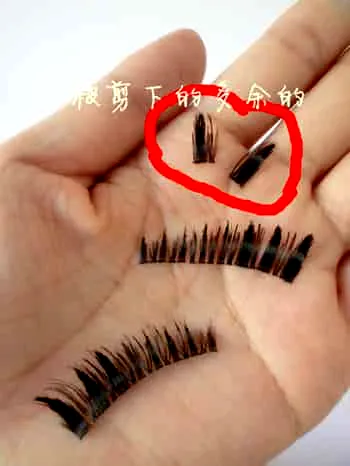 步骤六:根据自己需要选择喜欢的假睫毛,这里模特选择了自己喜爱的芭比系假睫毛,将假睫毛剪成适合自己眼型的长度,然后在睫毛根部涂上胶水,等待几秒后就可以粘贴在眼线上。