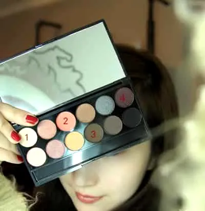 Step1:首先要选择合适的眼影,杏色、橘色、咖色、紫色都是必不可少的眼影组合。