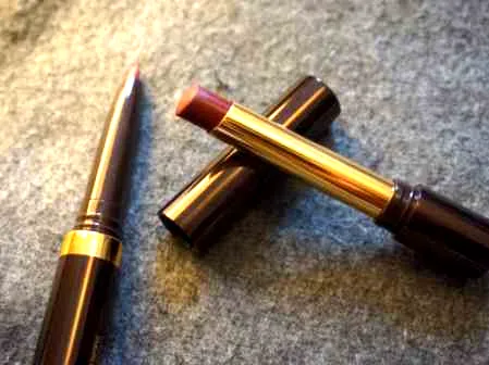 唇线笔是哑光带闪片的,唇膏端不算亮泽也不算纯哑光,算是半哑光的质地吧,质地润滑的刚刚好,一笔带过就会覆盖原有唇色,基本你看到的唇膏膏体的颜色就是呈现在嘴巴上的颜色,不会有太大的偏差。