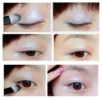 步骤二:找到白色眼影粉,先用眼影刷蘸取少量在眼窝部分涂满,再延伸至下眼睑眼尾部分,如图。