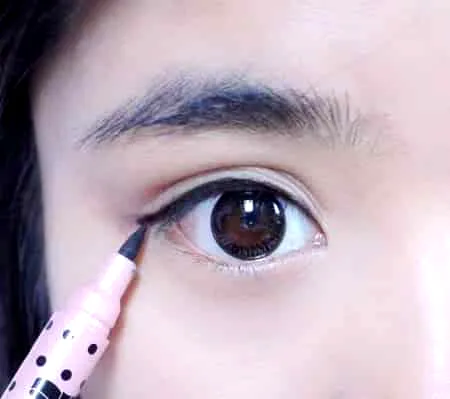 步骤九:接下来就开始眼睛的部分了,用眼线笔从眼头开始往后画一条线,不要往后翘,平下来就好。