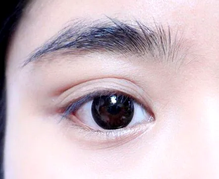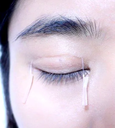 步骤八:贴好后把两端用剪刀剪掉,睁开眼睛就会呈现出上眼皮的效果了。