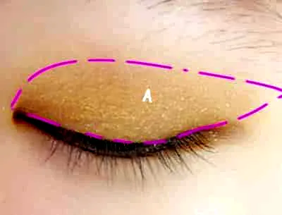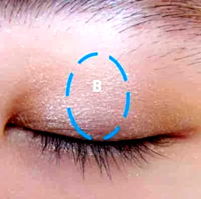 步骤六:再用B色的眼影涂抹在眼窝重心的位置上,加深眼部的光泽度以及眼部的层次感。