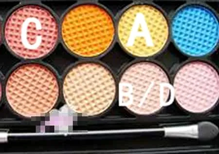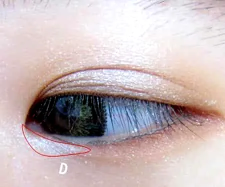 步骤七:用C色调的眼影涂抹在眼尾三分之二的位置上,D色眼影涂抹在眼头下眼睑三分之一的位置上,眼影可以瞬间提亮眼睛。