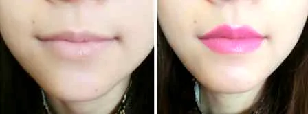 步骤九 :选择玫红色的口红,先描边,然后以填充的方法涂满嘴唇。想让自己的嘴唇更饱满一,就把嘴唇画得比原来的嘴唇大那么一点点就可以了。