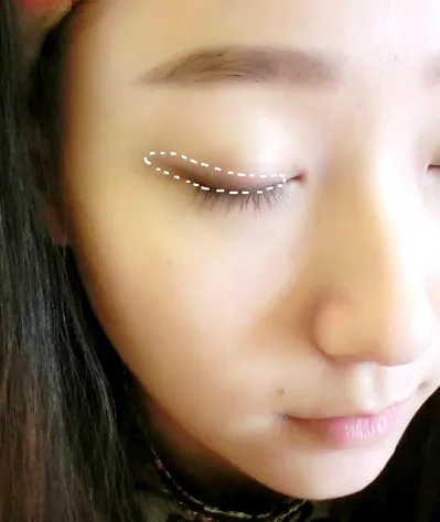 步骤三 :开始眼影的部分,取咖啡色的眼影,在最接近睫毛的眼皮那块轻轻的刷上,不要画的太浓。
