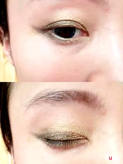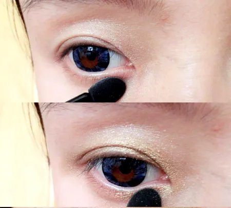 步骤三:开始眼睛的部分,取用一款银色的眼影涂抹在整个眼尾窝上,再用眼影刷蘸取金色的眼影,涂抹在眼头和眼窝上。