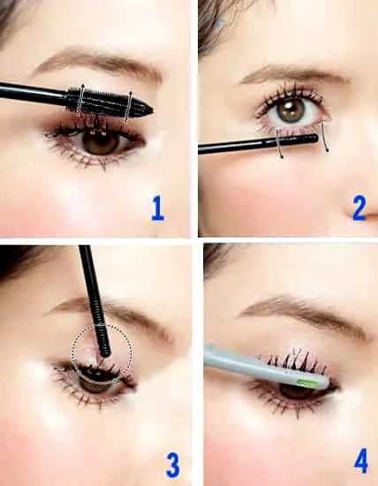 步骤2:选择纤细浓密的睫毛膏刷睫毛,从下眼睫的根部向下刷,箭头所示图。下睫毛呈现黑色,且根根分明,下眼睫的睫毛是不需要太浓密的。