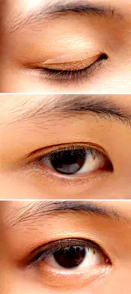 Step5:用眼影刷蘸取咖色眼影,从双眼皮褶皱的地方往睫毛根部晕染。