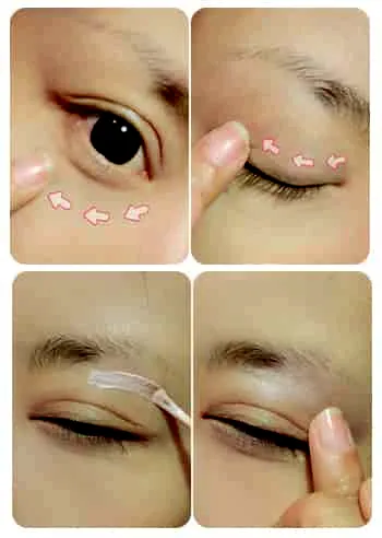 Step6:用珠光高光液在眉骨的下方轻涂,指腹在小范围内轻轻涂抹开,这样五官会比较立体有神。