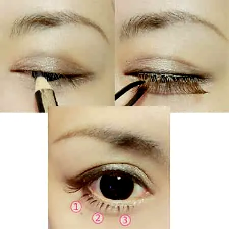 Step13:最后选择日系棕色下假睫毛,离开下眼睑尾部0.1cm开始小心粘贴,可以稍稍在下睫毛根部外。