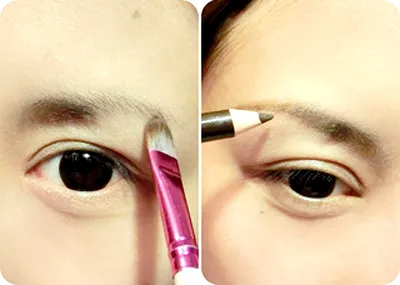 Step10:然后选择浅咖色眼影,找到双眼皮褶皱,从睫毛根部往上晕染眼影,范围在双眼皮褶皱内。