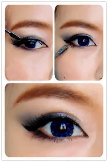 Step6:换一把中号的眼影刷,蘸取黑色眼影从眼珠正上方往后勾勒眼线,下眼线也要,如图。