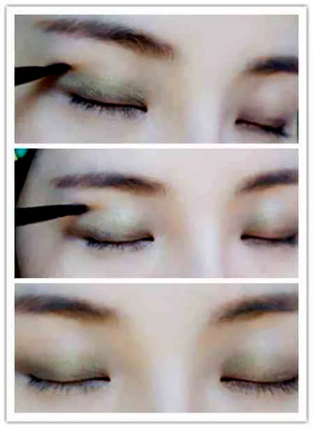 步骤4:使用糖果绿色的眼影涂在深色眼影的上端,记住不要留下缝隙,用笔将两色晕染一下,会显的更自然,渐变效果也会更好。