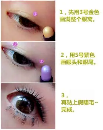Step4:然后选择淡紫色的眼影笔,在眼头和眼尾的地方分别局部涂抹。