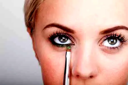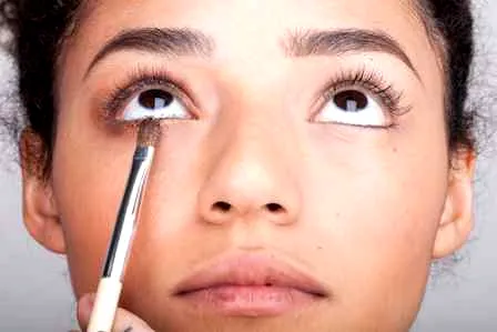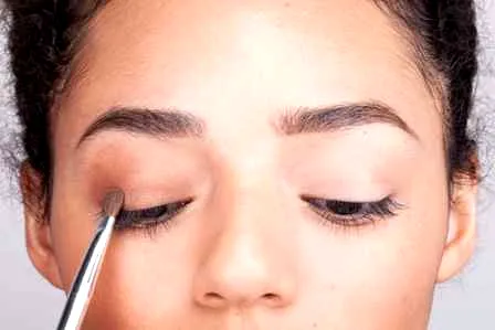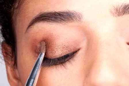 步骤二:打造烟熏妆。选择一种与肤色相称的眼影色,这里选择的是暗古铜色。用眼影刷在上眼皮涂抹一个略大的半圆,再沿下睫毛底部涂抹。
