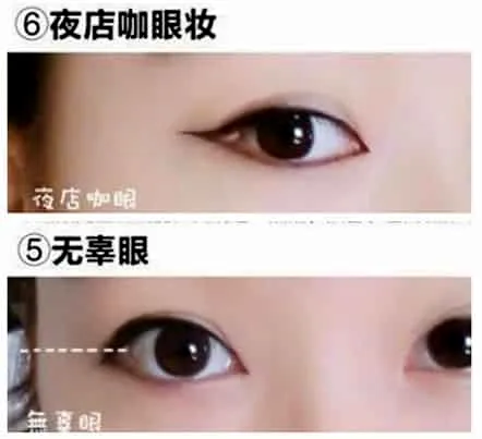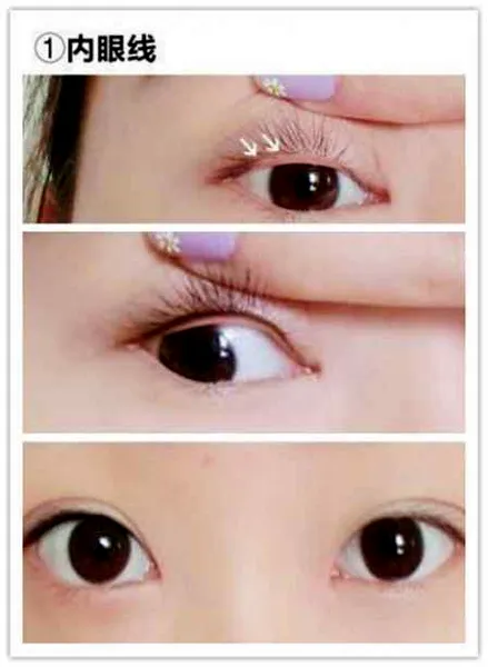 内眼线:将头稍稍抬,手压住眼皮上提,直到看到睫毛的根部,然后用眼线笔在睫毛缝隙里填满,慢慢的涂黑。涂好后,睁眼的效果,左边画了比右边的眼睛明显更加有神。