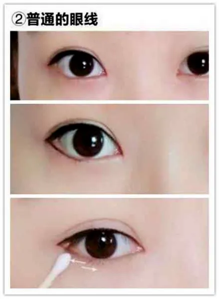 普通的眼线:普通的眼线是根据自己的眼型来走的,也是使用比较大的,适合日常生活妆容。在内眼线的基础上把眼线加宽,下眼线画一半,眼头空出来不画。用棉棒左右来回的晕染眼线,把生硬的线条晕染开即可。