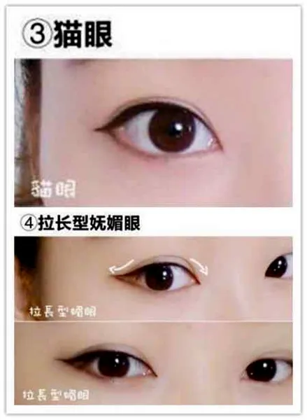 猫眼:在画好的内眼线的基础上,把上眼线加宽,画到眼尾时透明微微下压,然后上翘。形成一个自然的弧度。下眼线往上与上眼线眼尾接合。最后用棉棒晕染下眼线,猫眼妆就完成了哦。