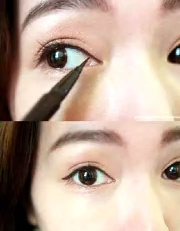 步骤四:然后开始眼线的部分,因为这款妆容比较淡,所以我们使用巧克力色的眼线液,从眼头的处开始往后画,沿着睫毛根部,不要画太出来,搭配橘粉色妆容,不然就会显得妆容很浓了。